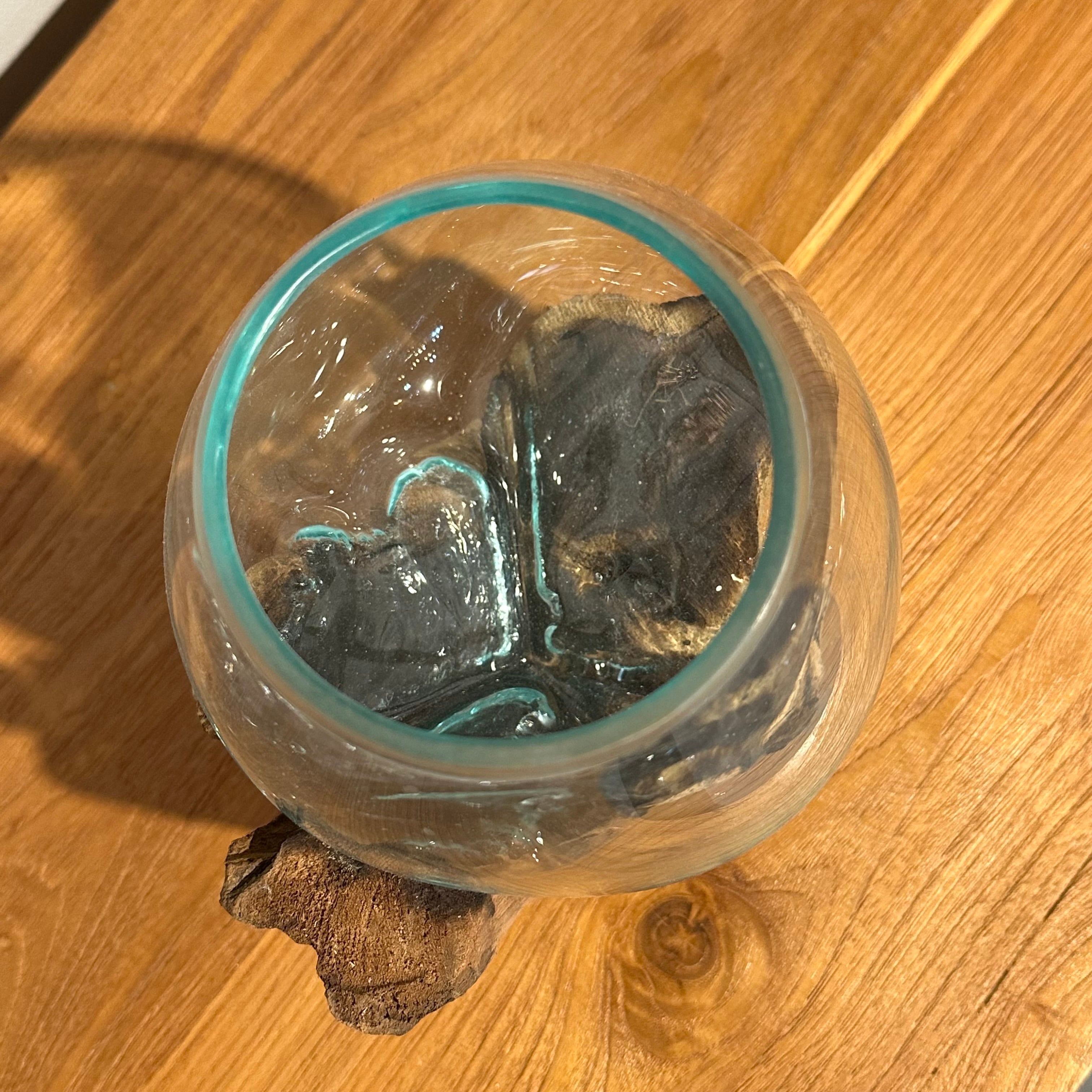 ウッドとブルーが美しいバリガラスのコラボレーション。