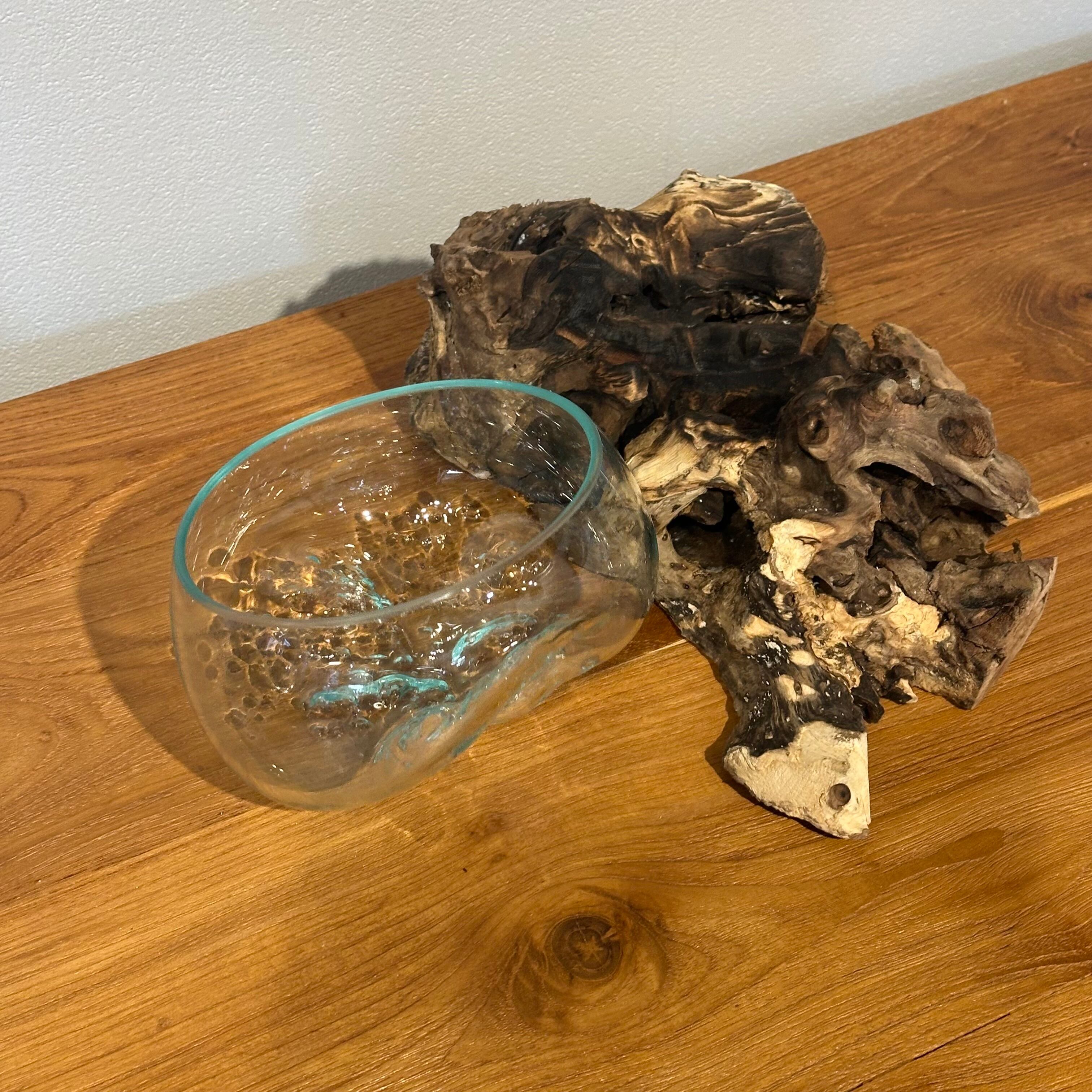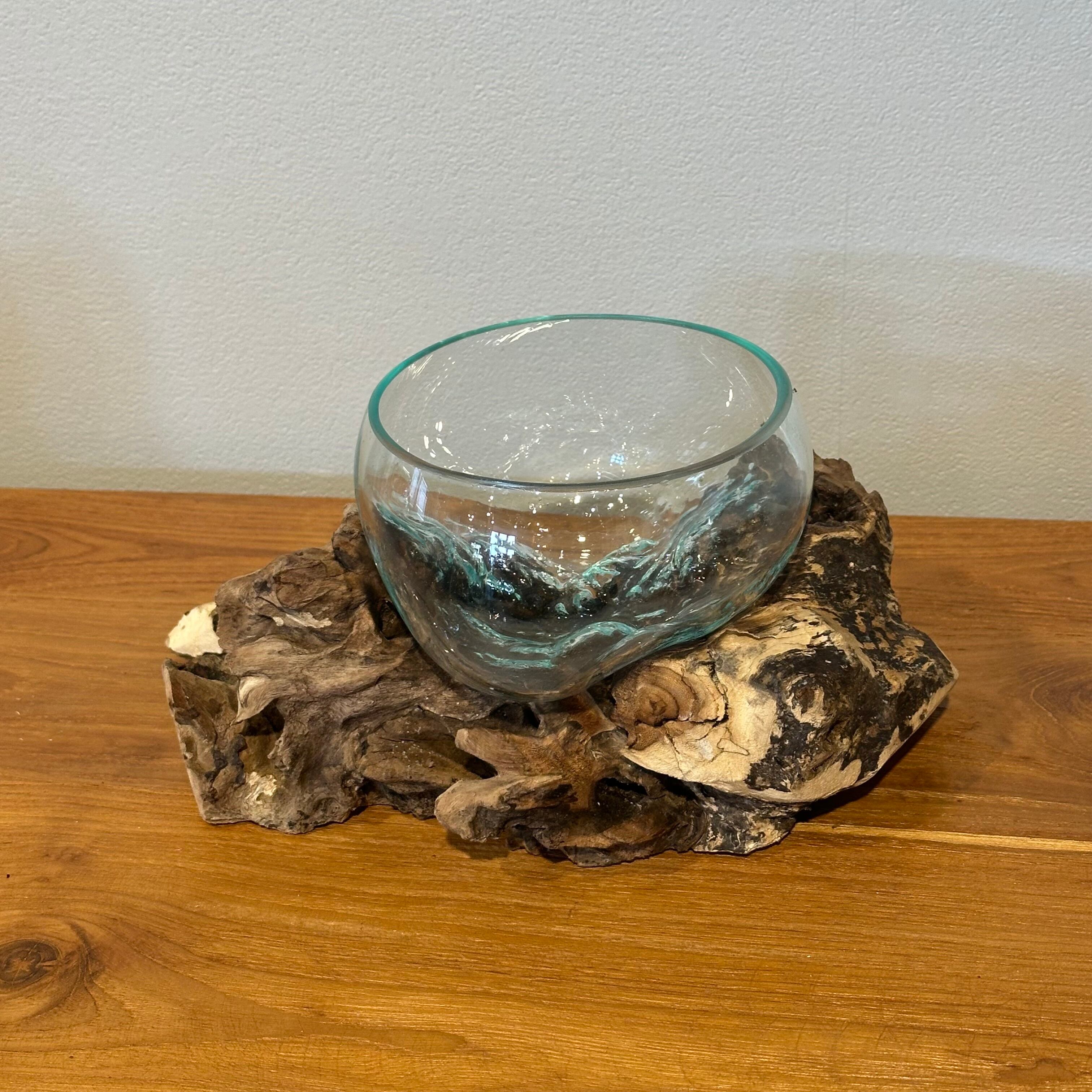 ウッドとブルーが美しいバリガラスのコラボレーション。
