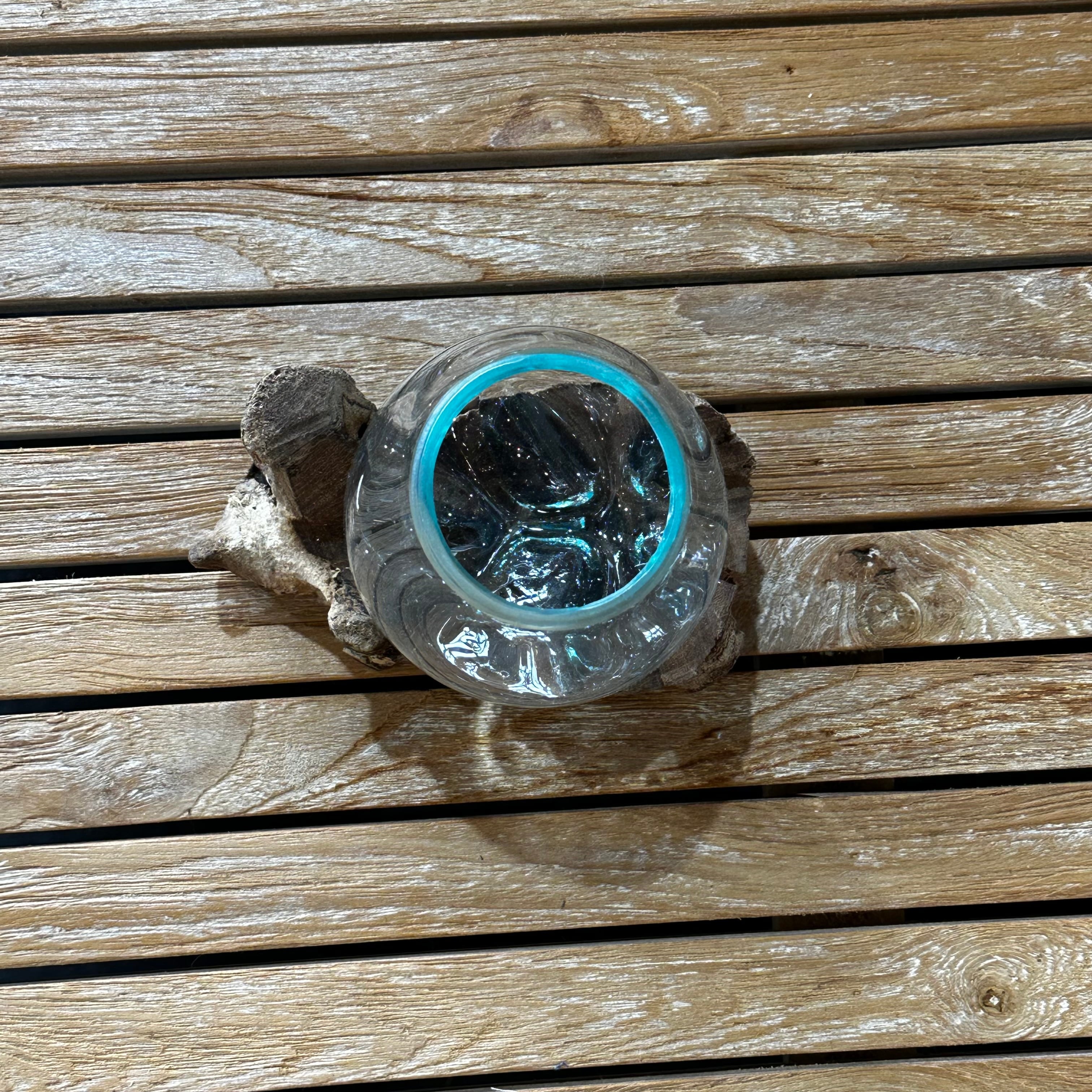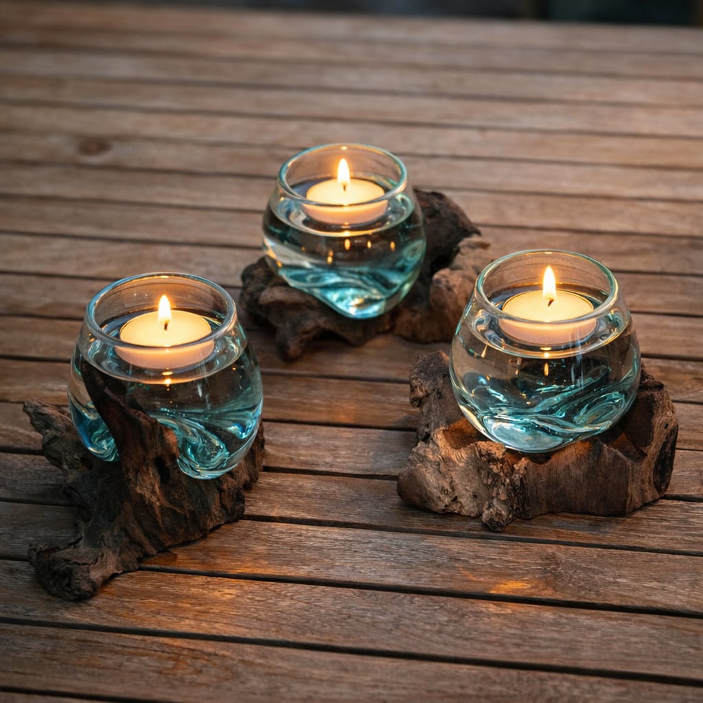 ウッドとブルーが美しいバリガラスのコラボレーション。
