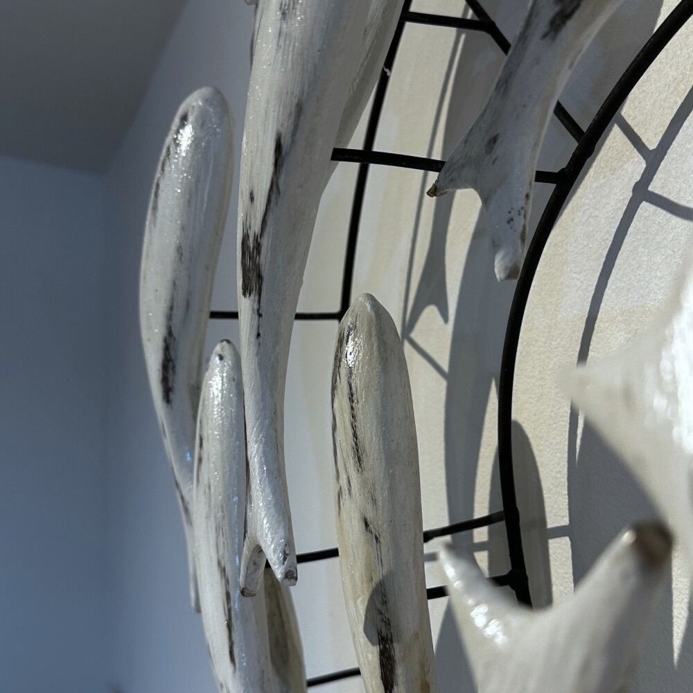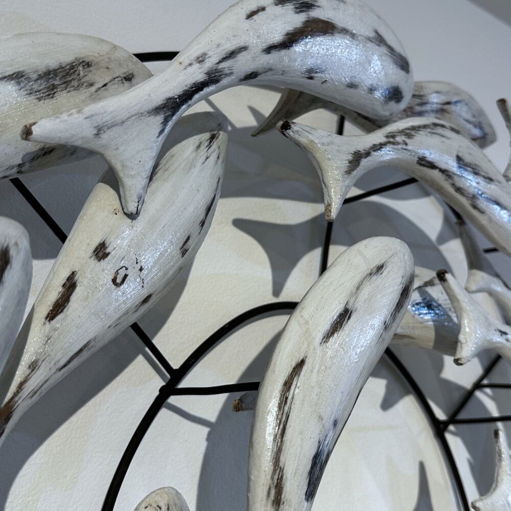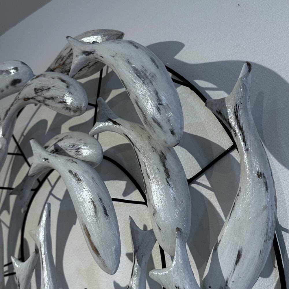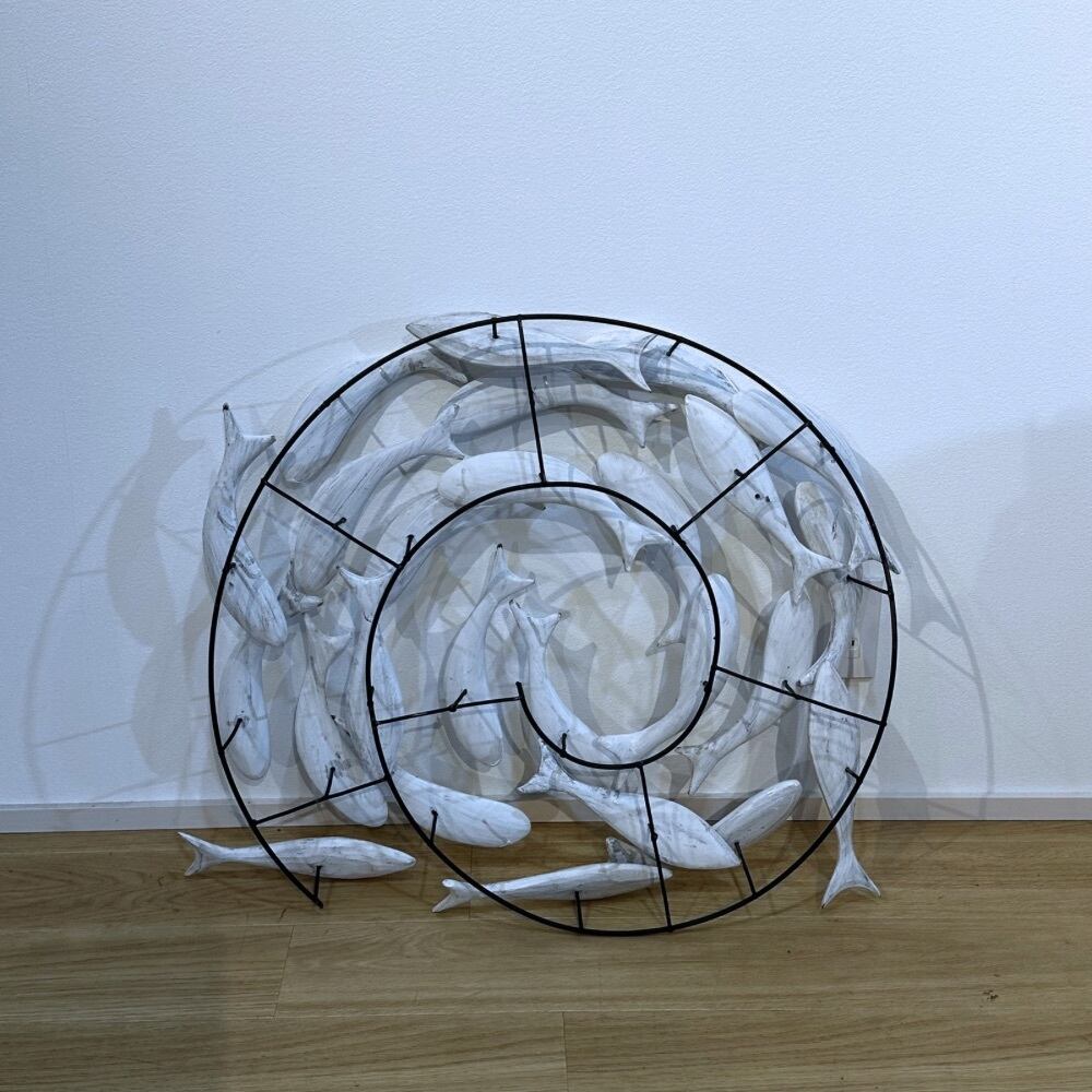 まるで壁に魚の群れが寄ってきたかのようなおしゃれなウッドアート。